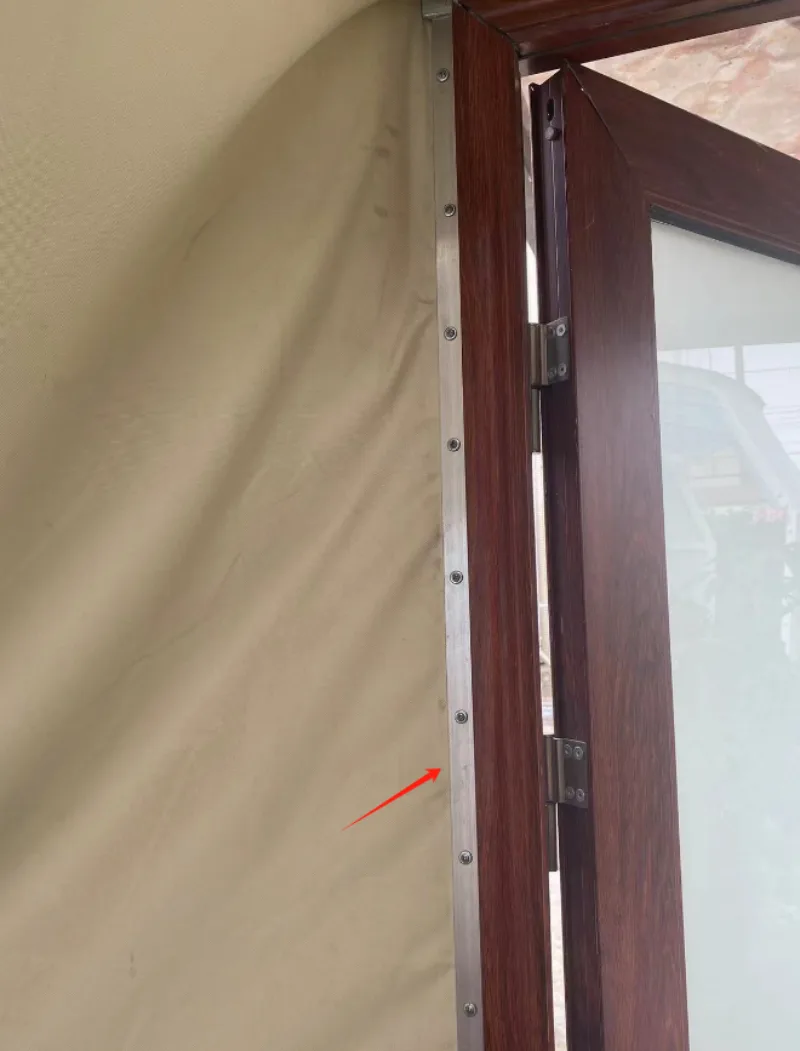5. Connecting to the Door Frame: Stretch the membrane over the outside of the door frame, ensuring it is taut. Use self-tapping screws and aluminum strips to secure the membrane along the sides and top of the door frame.