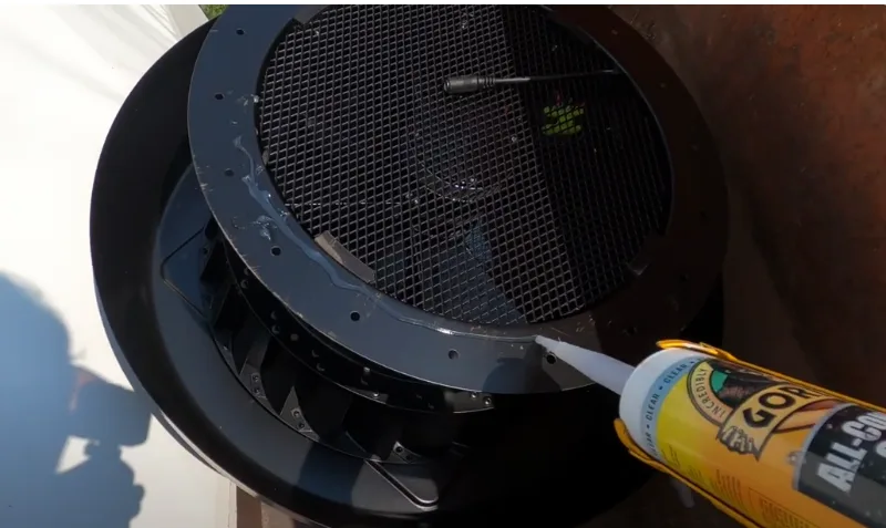 2. Drilling and Applying Adhesive: Drill holes along the edge of the circle on the PVC fabric and apply glass adhesive around the edges of the exhaust fan for additional stability.